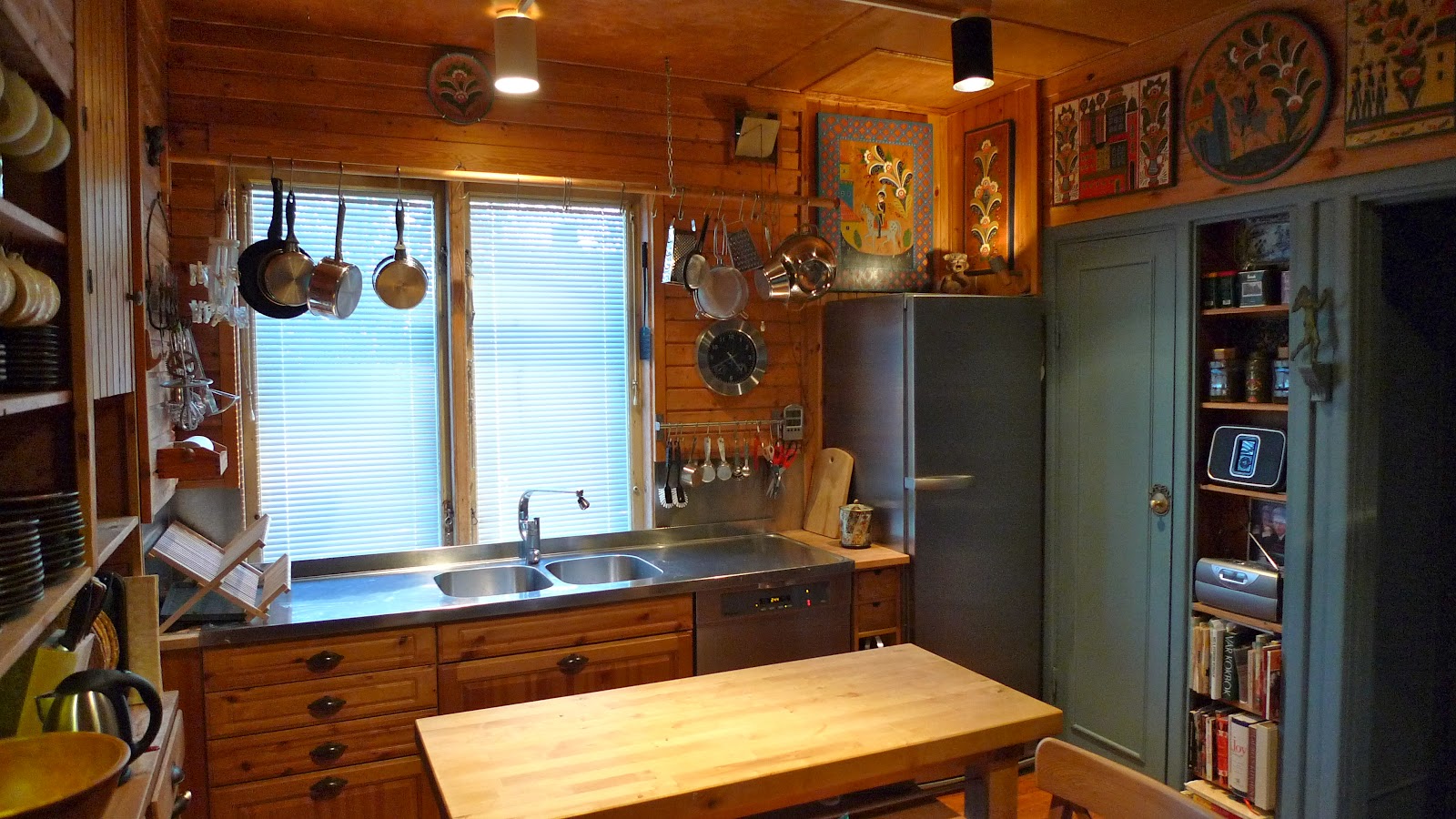 My creative American grandmother Olga loved going to flea markets (as I do now) long before it was fashionable. She inspired me to paint Swedish Folk Art. My kitchen is an expression of all this.