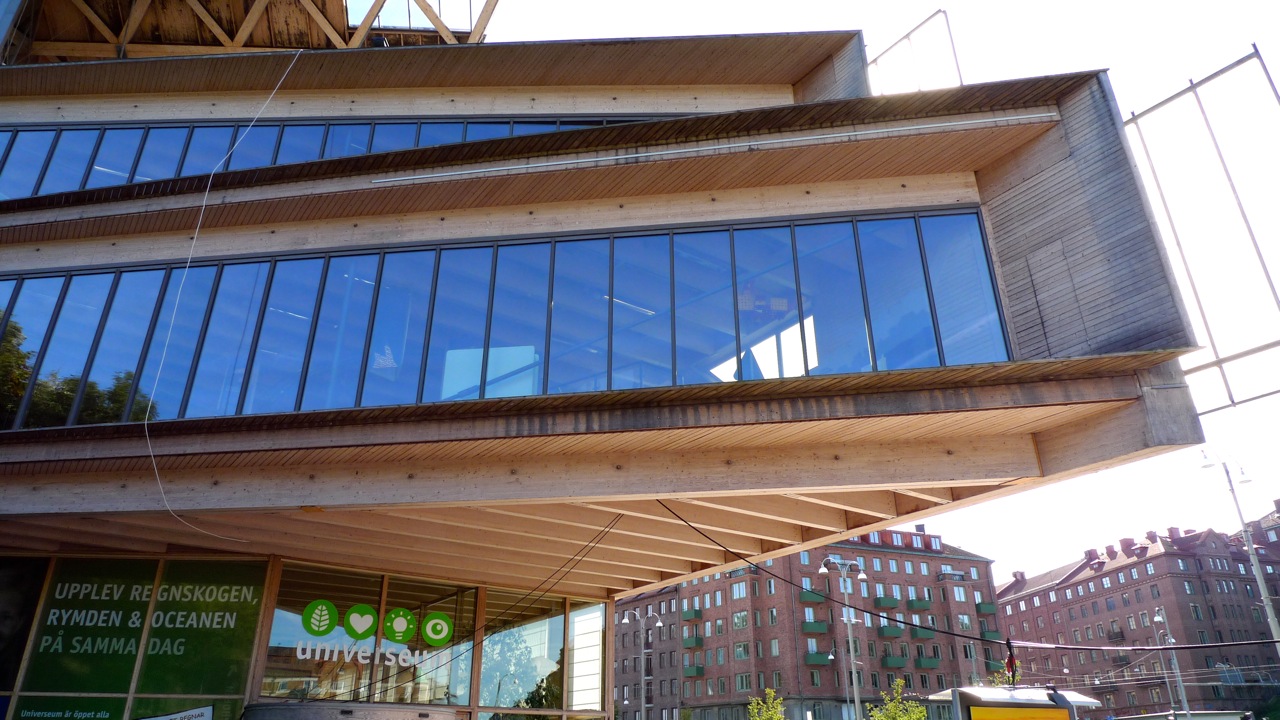 The Universeum Science Museum in Gothenburg, Sweden is built of glued laminated wood beams (stronger than steel ). It is well worth a visit. Don't miss the tropical rain forest and the shark tank. And there is a lot more!
